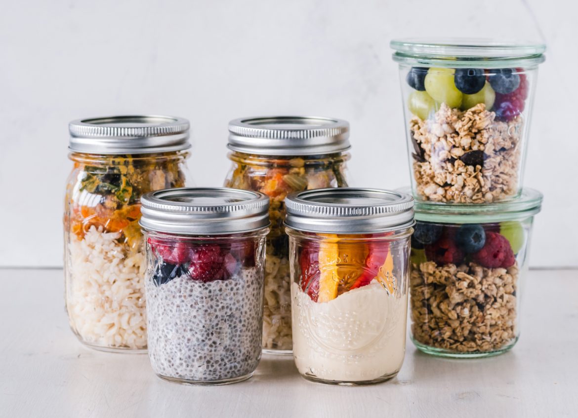 Jars of chia pudding, veggies, fruits, sauerkraut, and granola